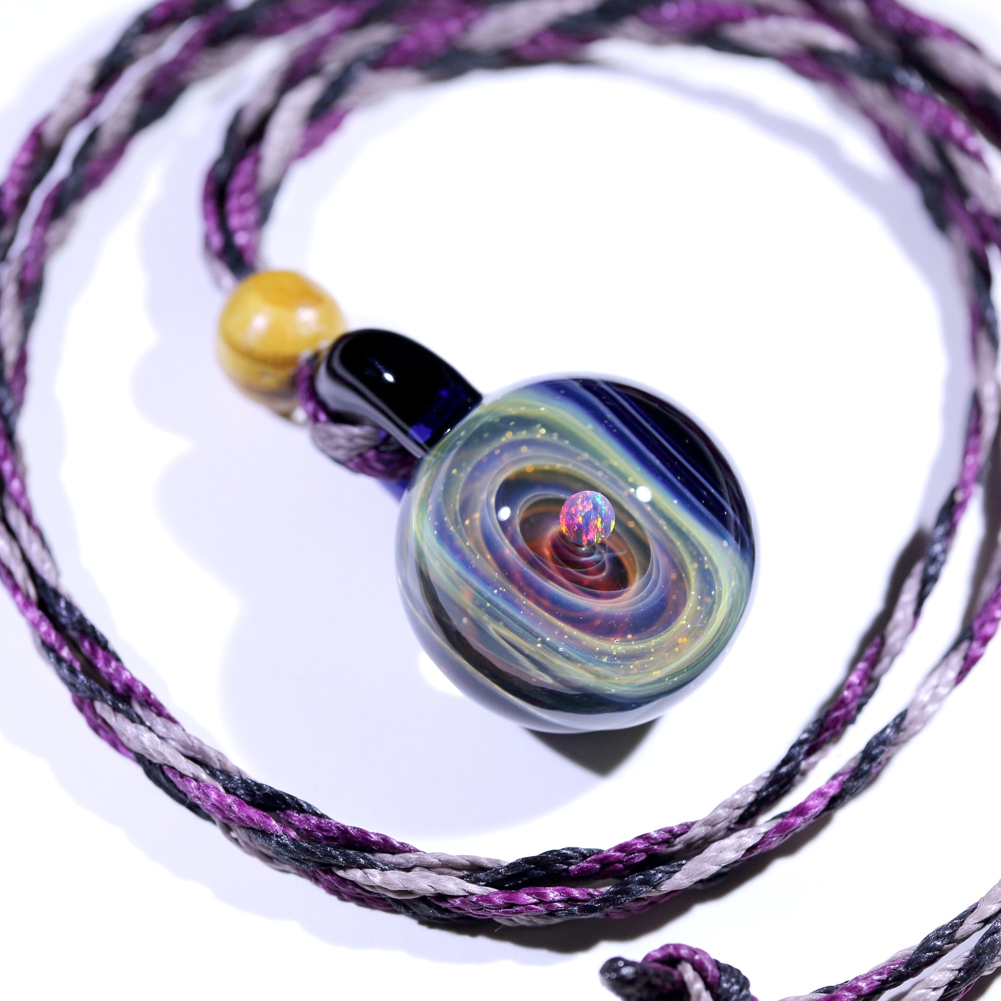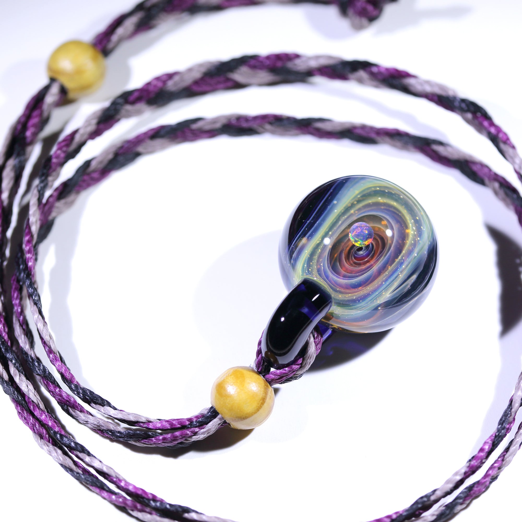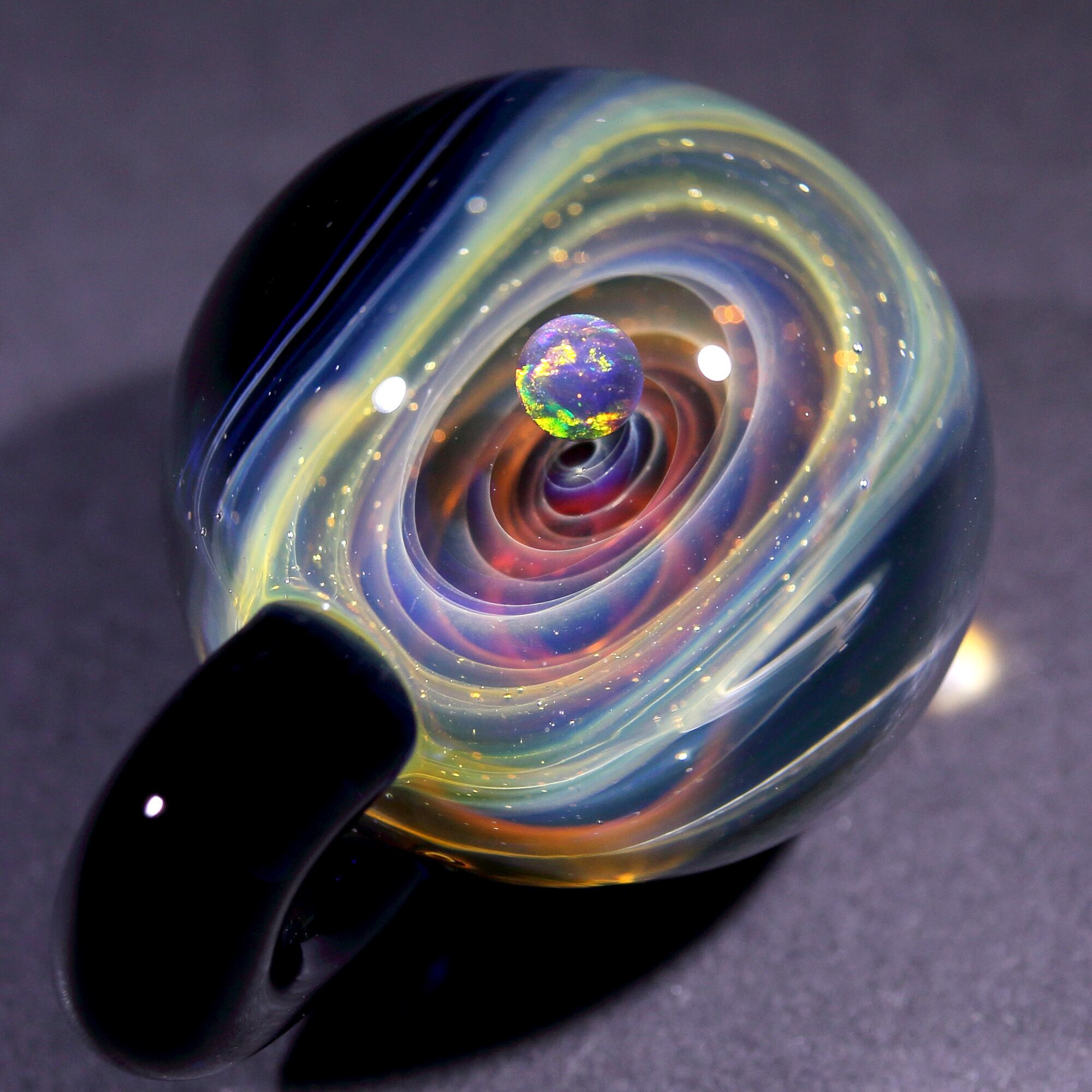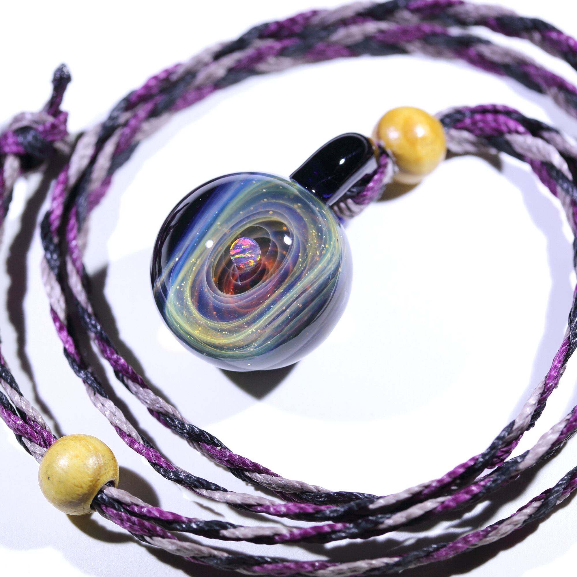 螺旋状銀河にオパールを閉じ込めた宇宙ガラスネックレス。