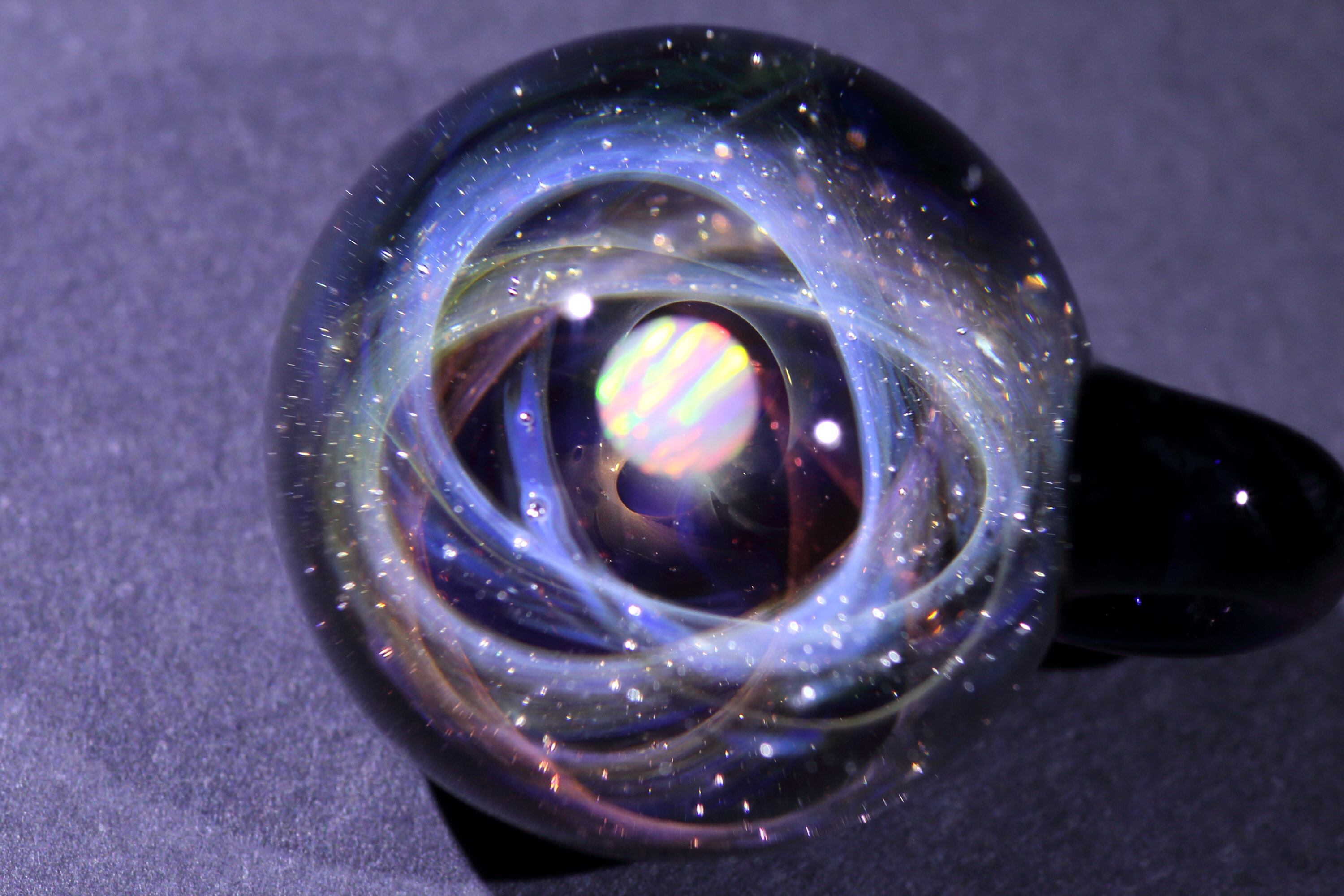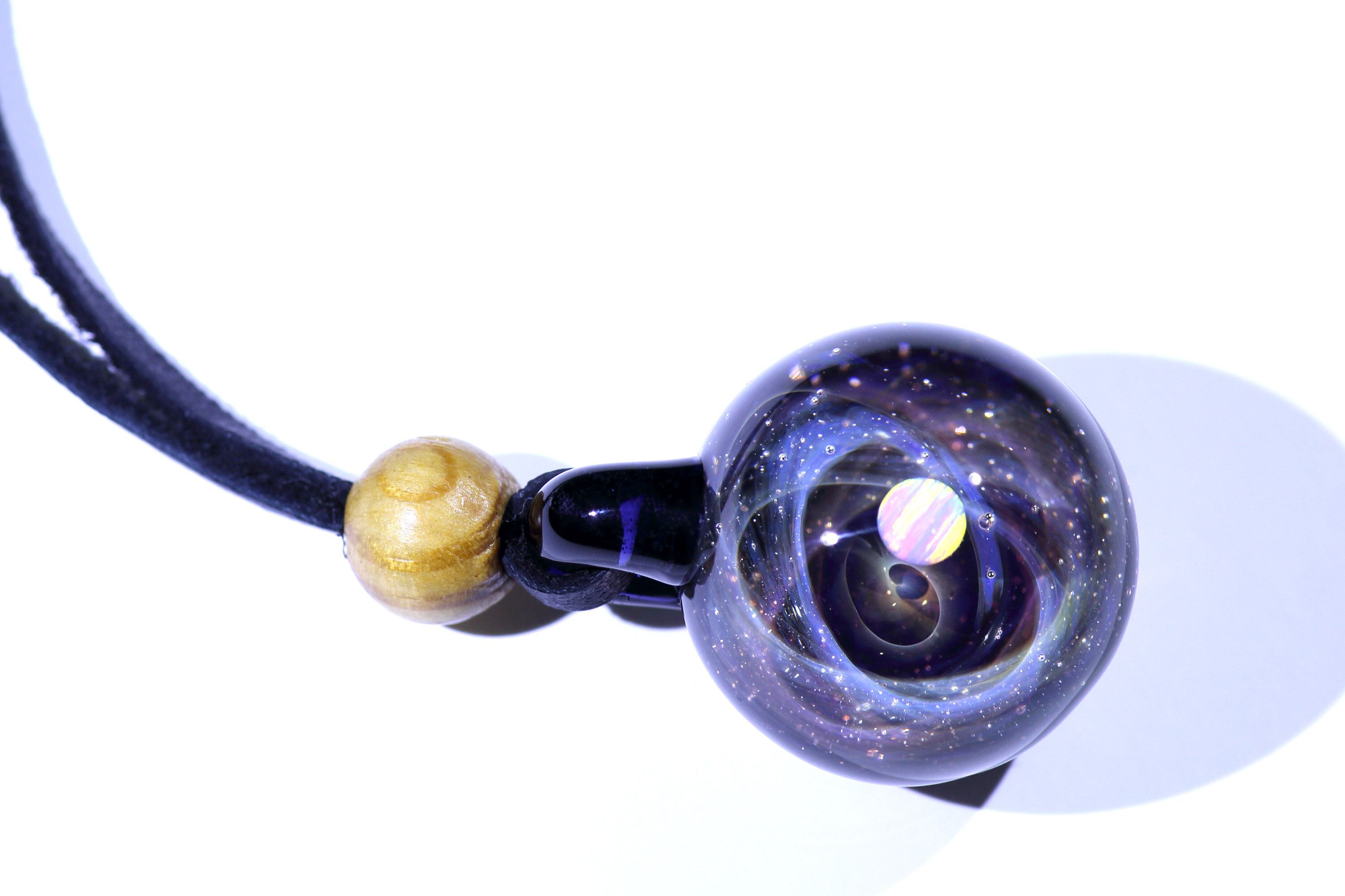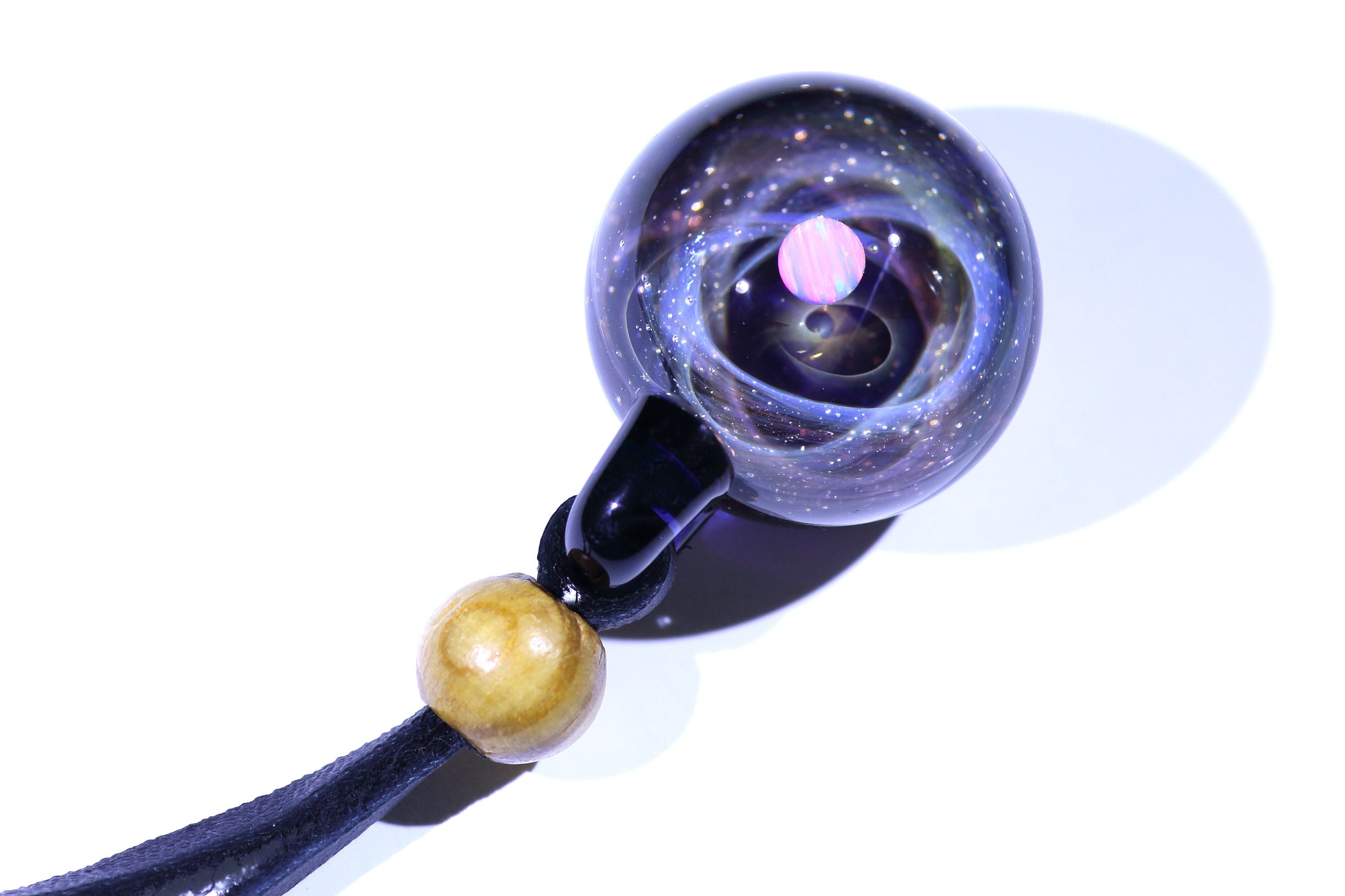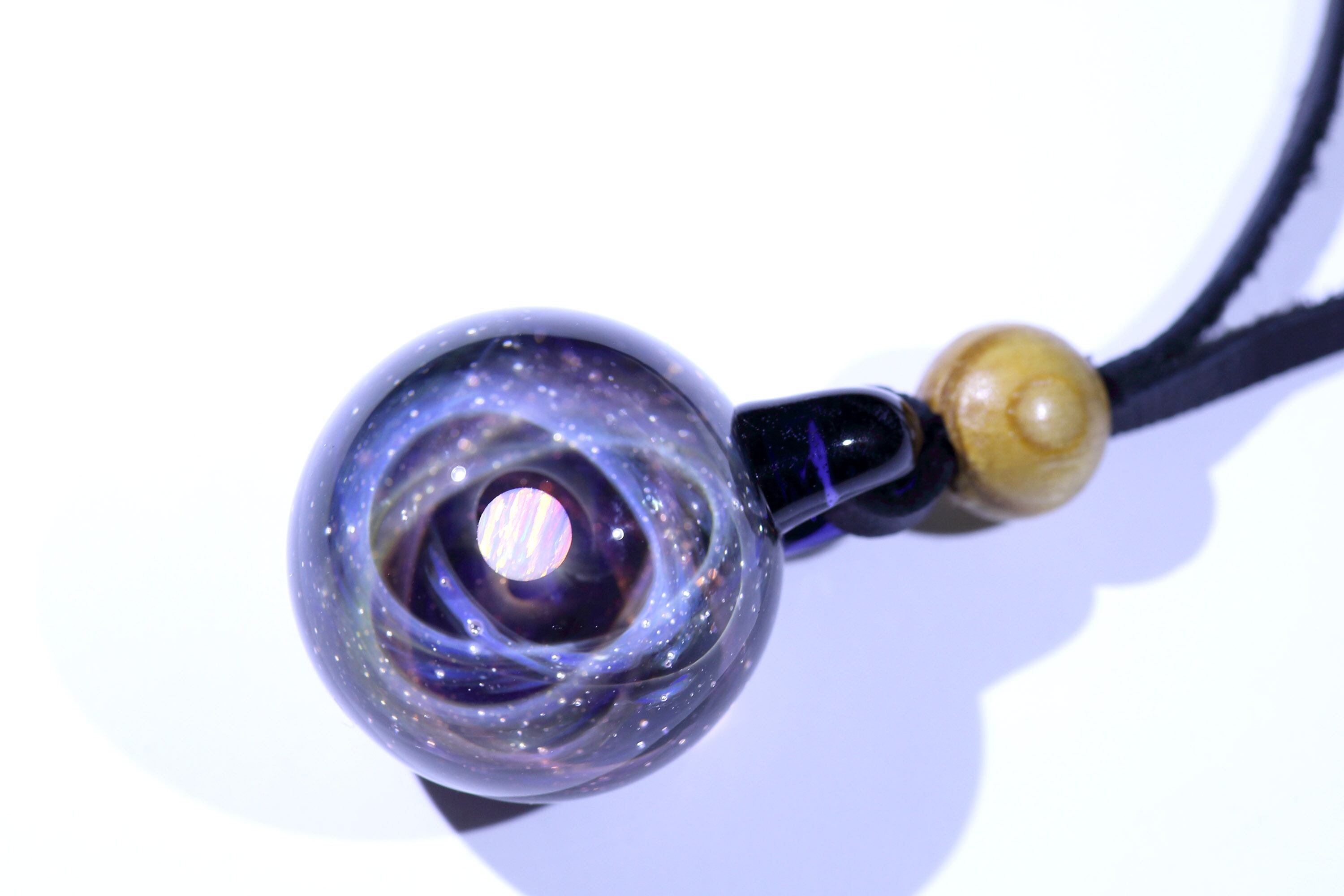 螺旋状銀河にオパールを閉じ込めた宇宙ガラスネックレス。