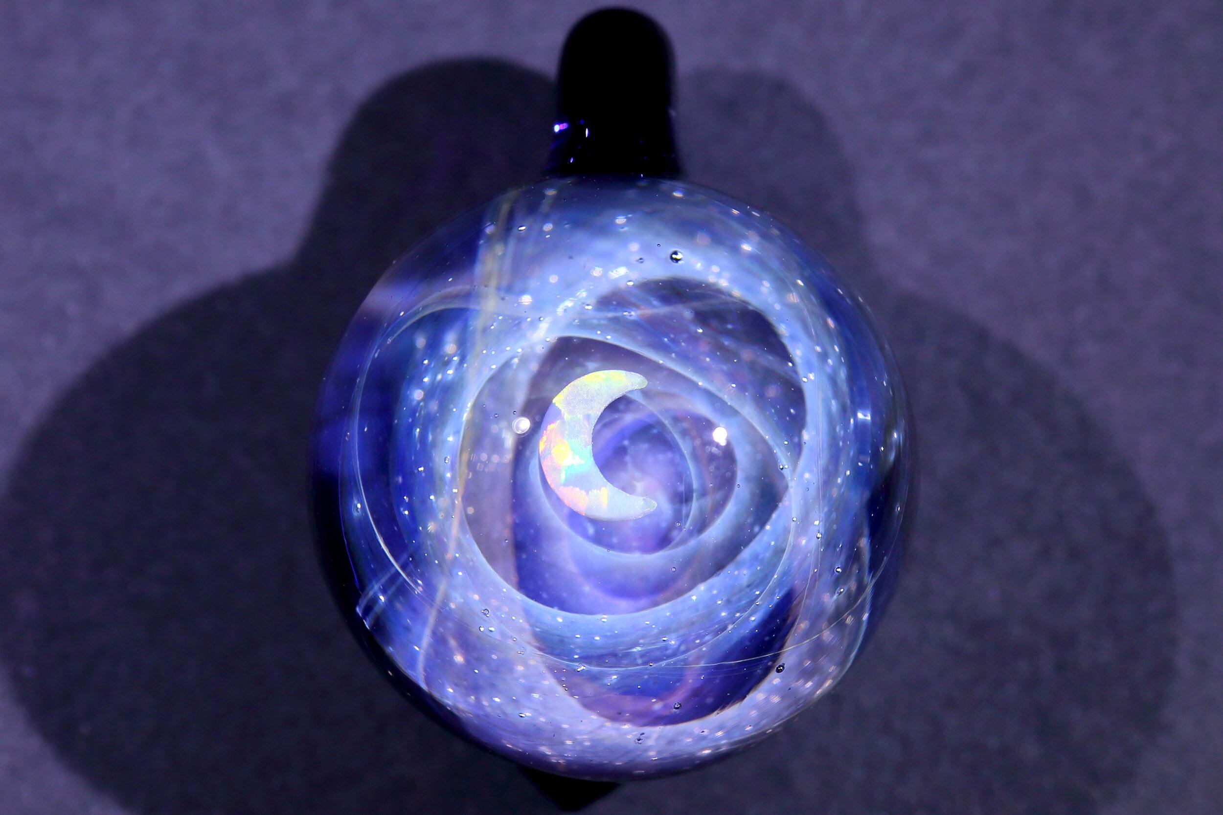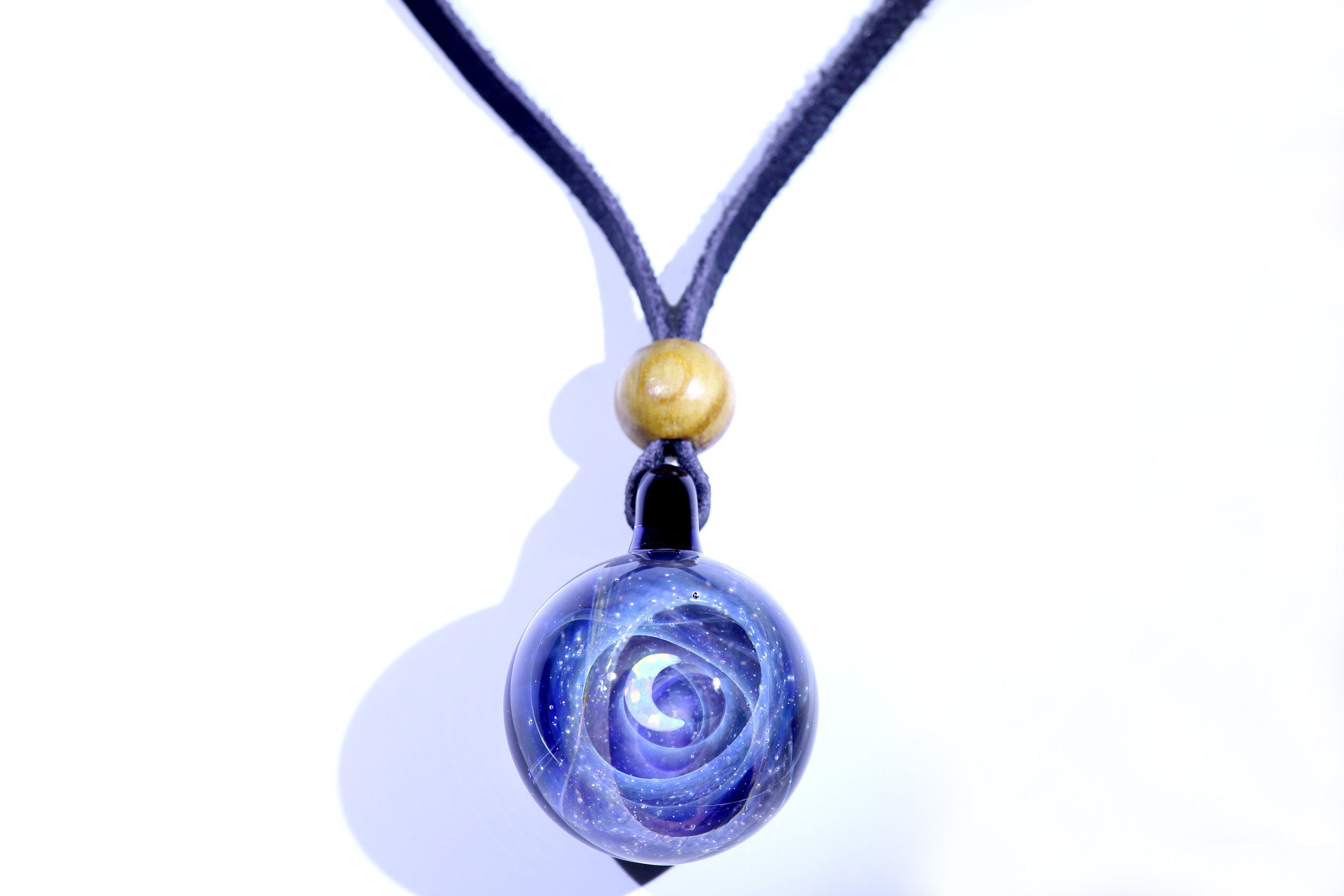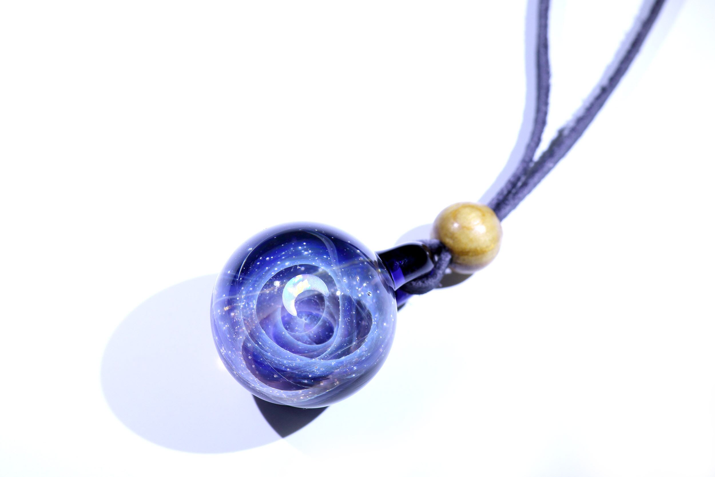 螺旋状銀河にオパールを閉じ込めた宇宙ガラスネックレス。