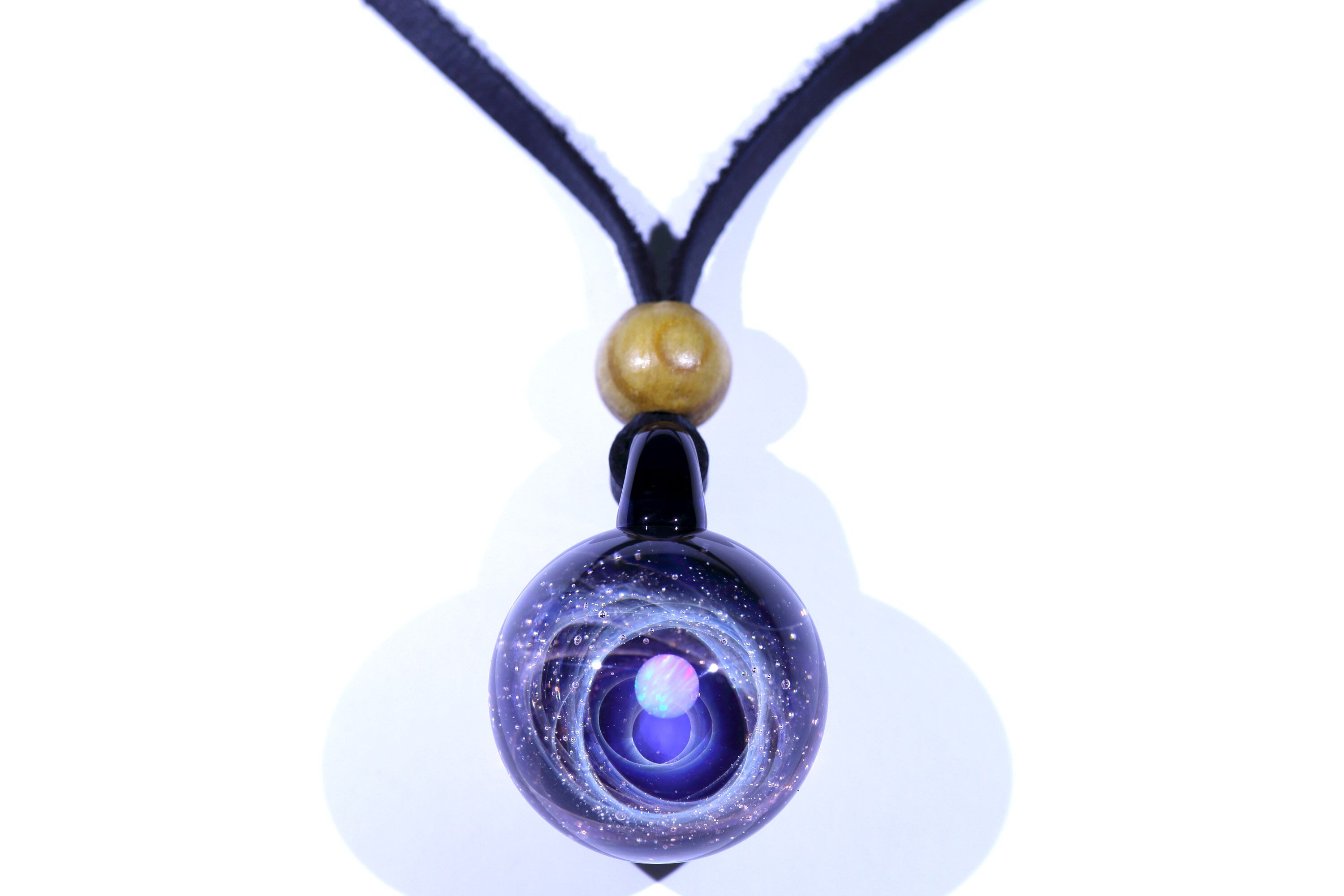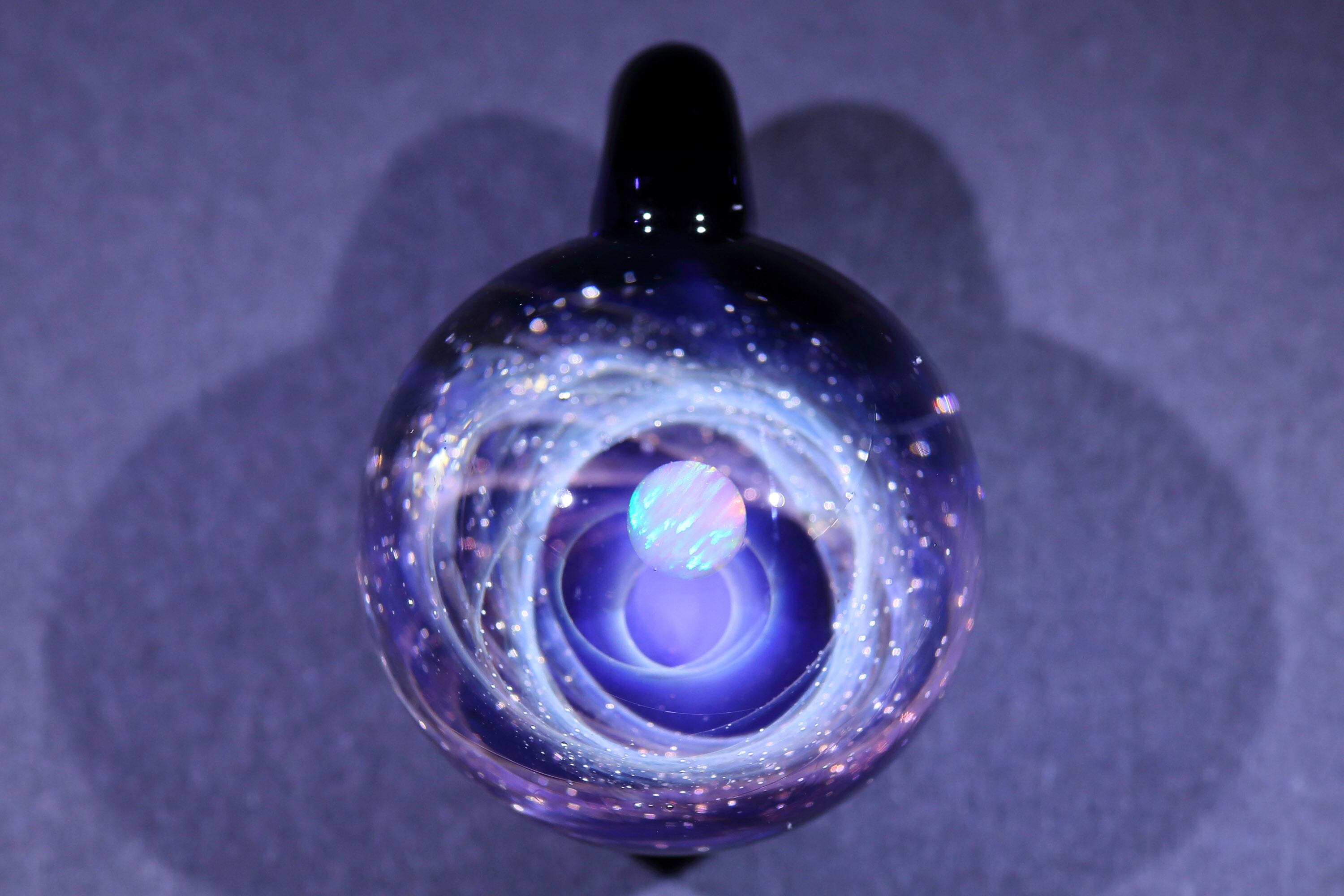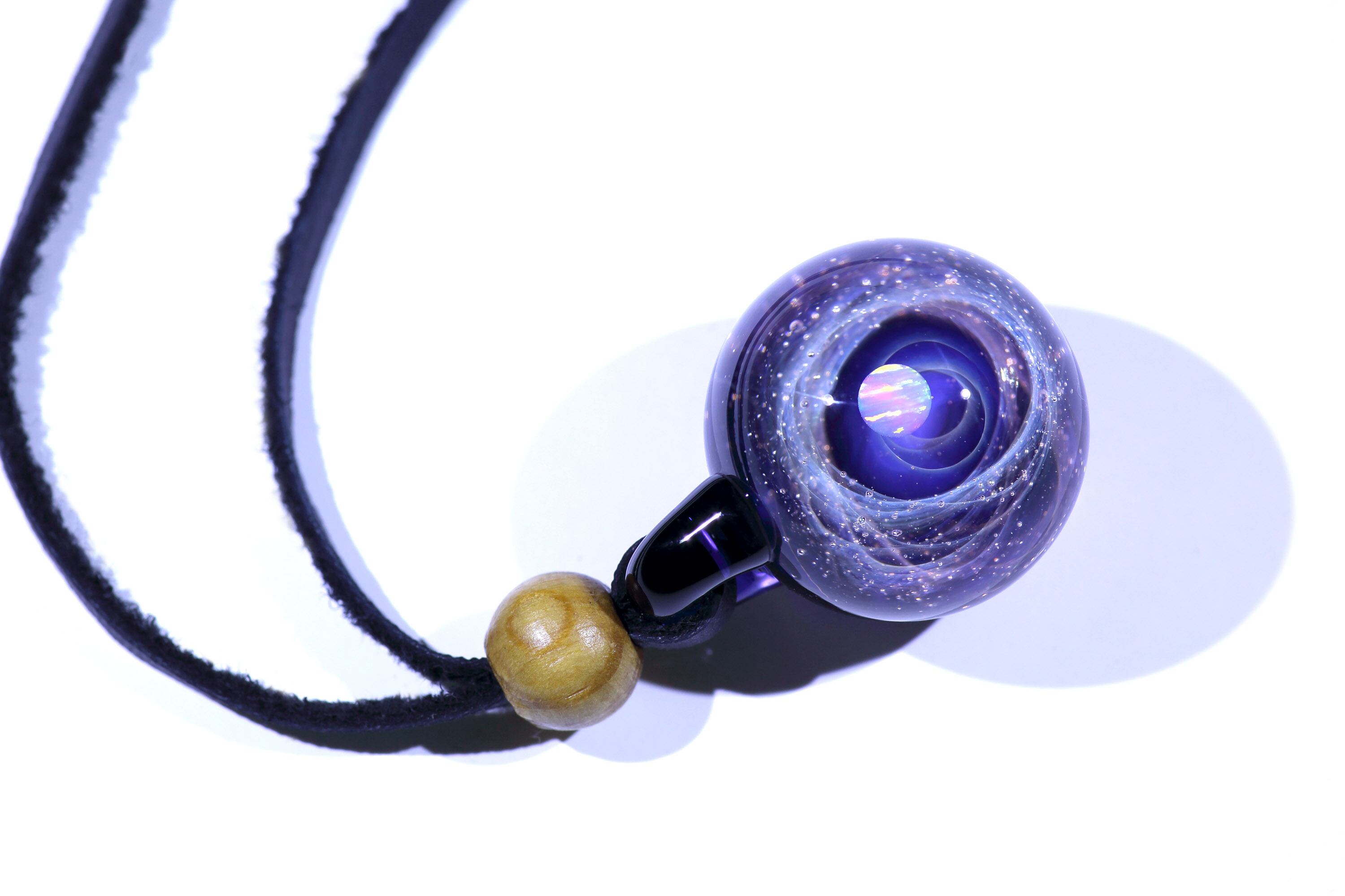 螺旋状銀河にオパールを閉じ込めた宇宙ガラスネックレス。