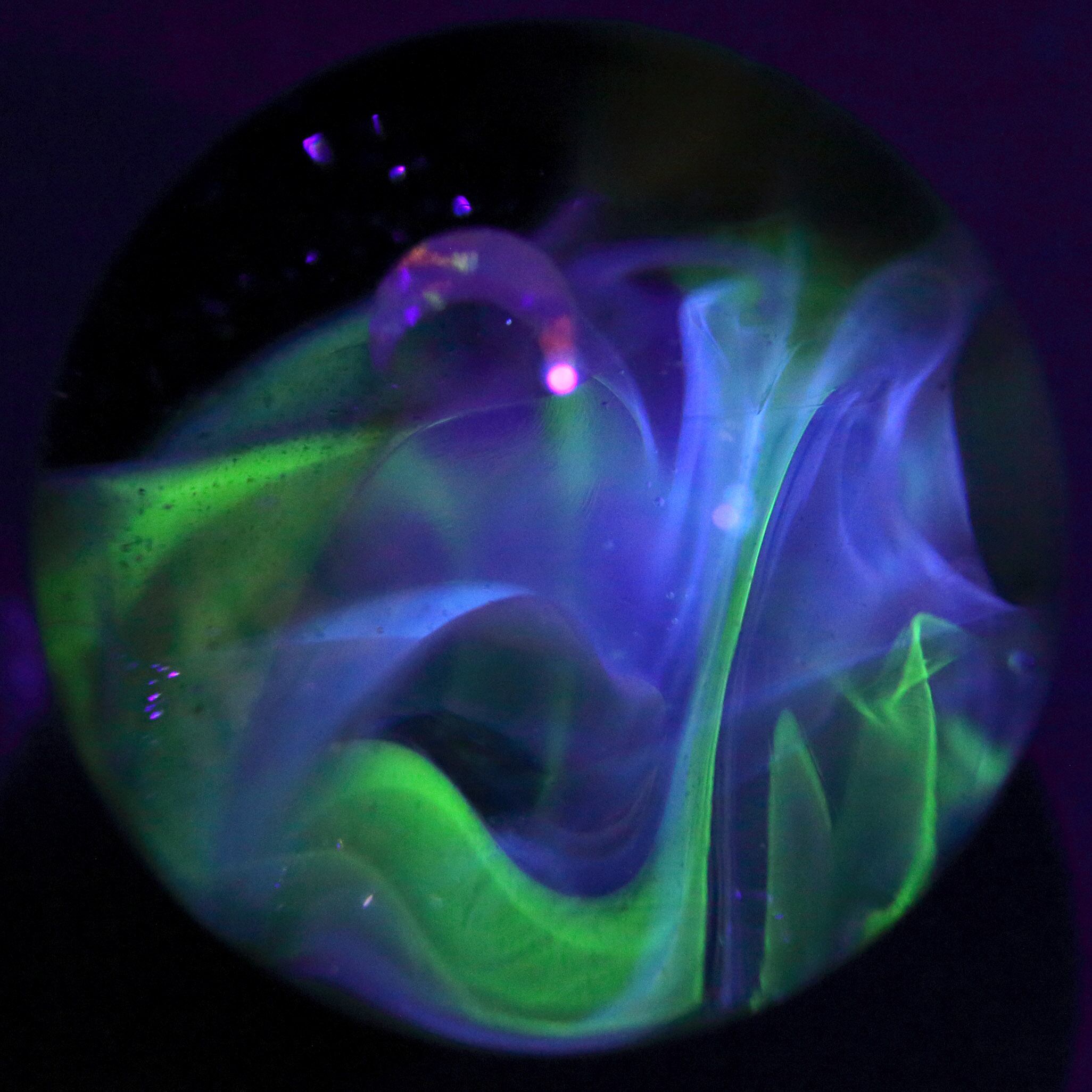 UV反応ガラスによって作られたこちらの球体ガラスは、魅惑的な光の波長のパワーを秘めています。
