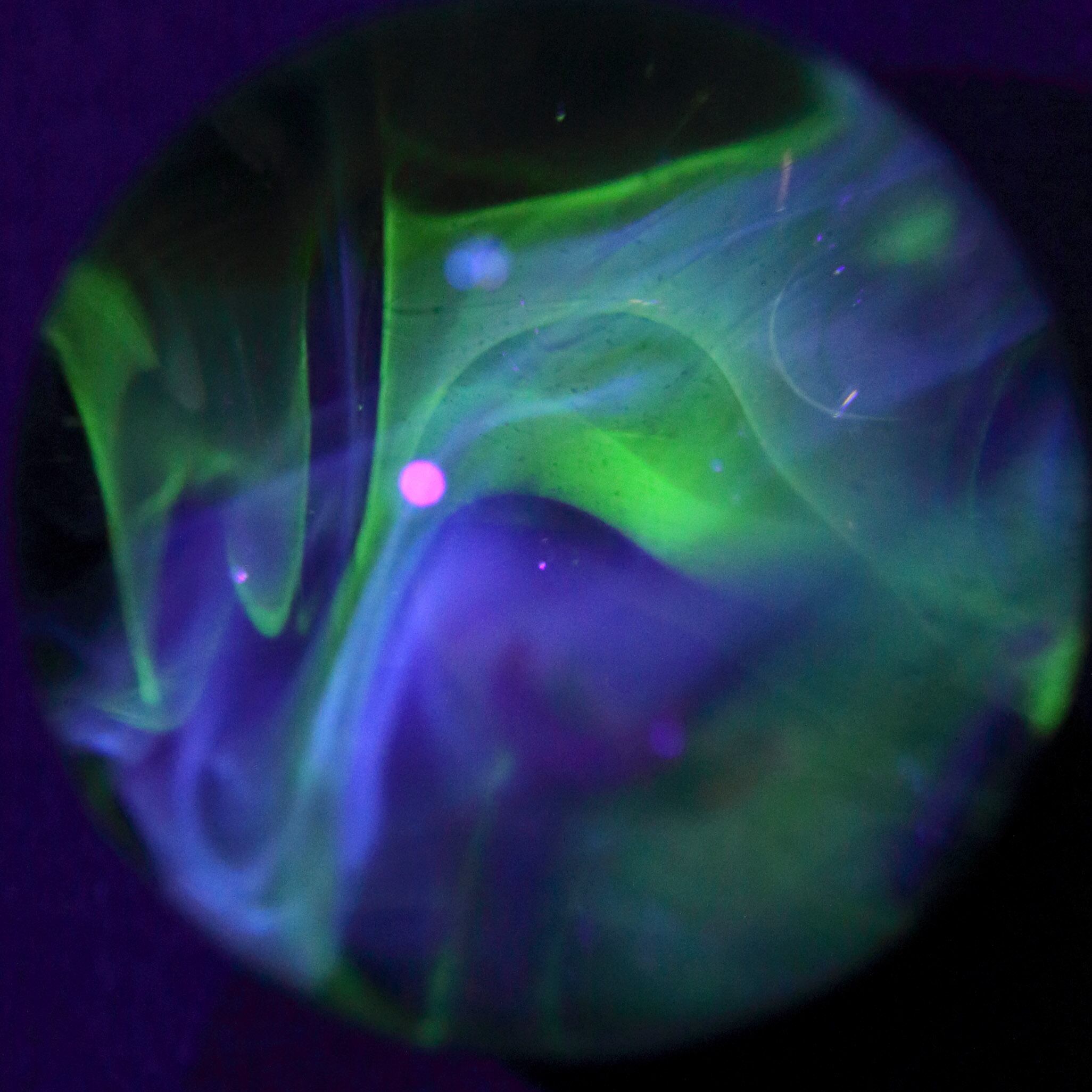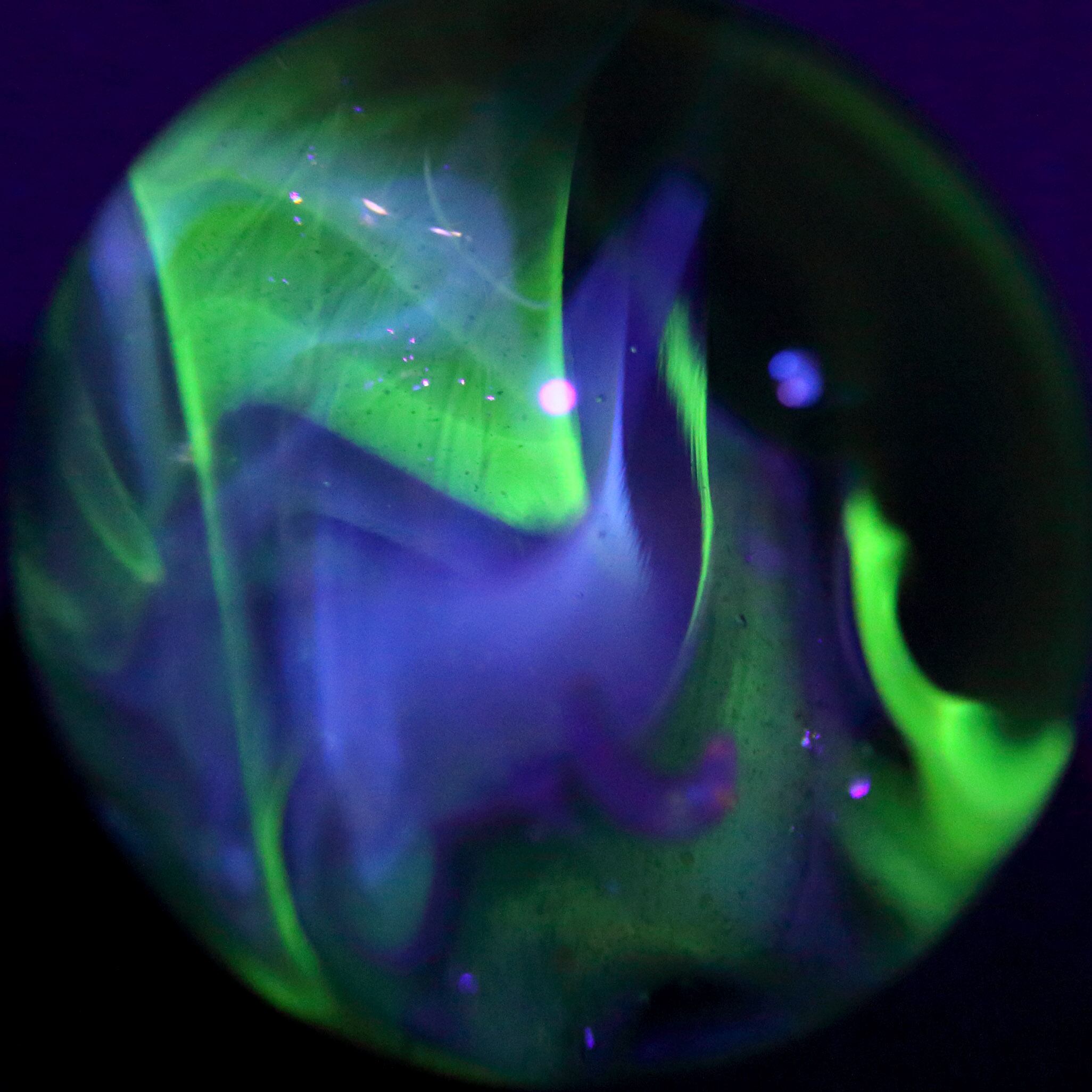 通常の光の下では、静謐なブルーとグリーンで輝き、UVライトの下では、青々としたグリーン、セルリアンブルー、かすかなピンクからなるオーロラへとダイナミックに変化します。